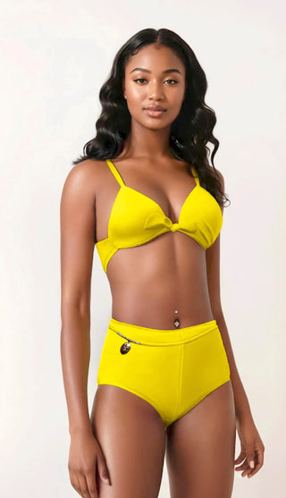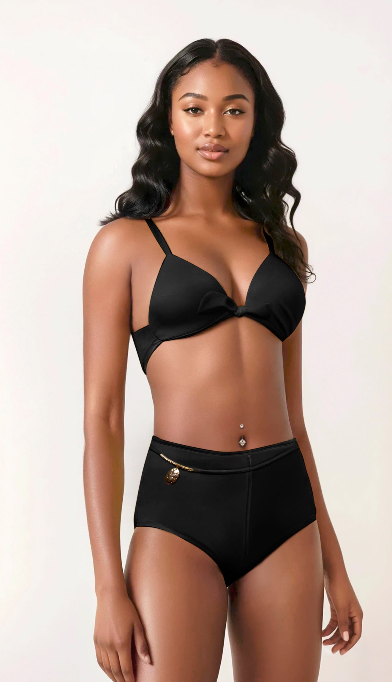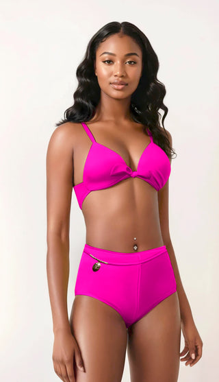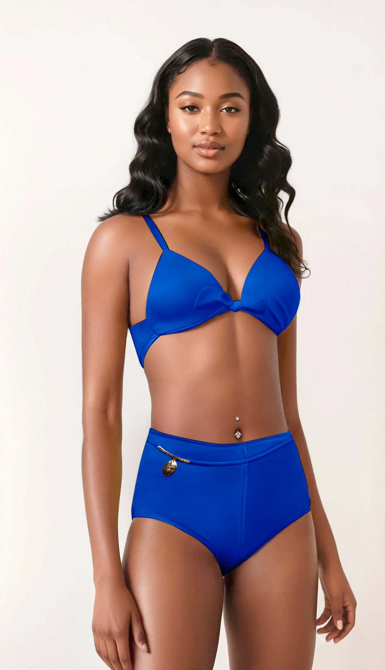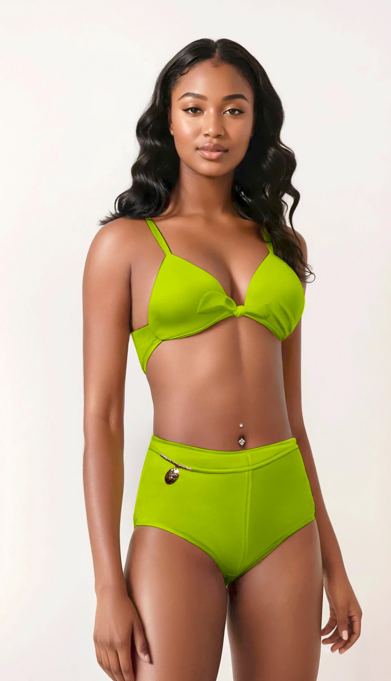 Electric colors in Italian lycra that pops like a summer sunset, with a flirty bow-tie center on the triangle top that adjusts for the perfect plunge. High-waisted bottoms with cheeky-to-moderate coverage and a signature Italian made 18-karat gold-plated shell medallion charm dangling from the waistband—handcrafted in Italy for that subtle heirloom shine. Fully lined, quick-dry, and compressive for all-day confidence, whether you're poolside or beach-to-bar.
