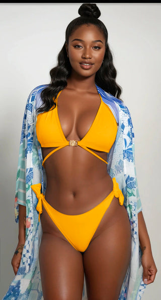 Vibrant matte lycra in a classic triangle top and tie-side Brazilian bottoms, elevated by handcrafted Milan-made 18k gold-plated chains with delicate sea-inspired charms (tiny shells, starfish, and beads) that drape across the side of the body., moving like underwater treasure with every step. Adjustable ties, removable cups, and sculpting fit,