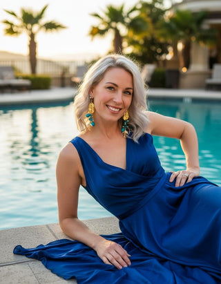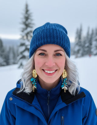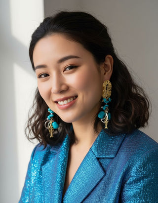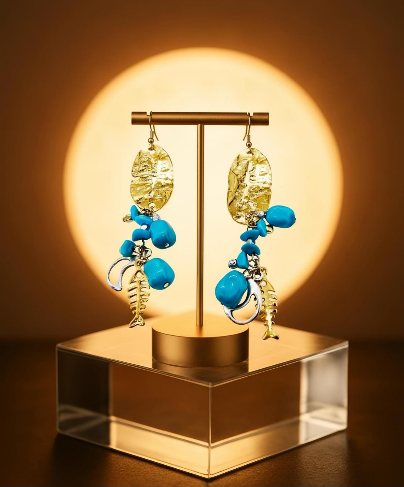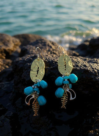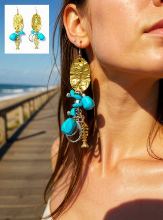 A little piece of Capri on your ears. Crumpled, molten 18k gold-plated oval discs catch the light like sun on waves, then spill into a joyful cascade of vibrant turquoise magnesite nuggets mixed with tiny gold-plated sea charms: seahorses, fish skeletons, coral branches, and lucky rings. Every movement makes them dance and sparkle like the Mediterranean itself.