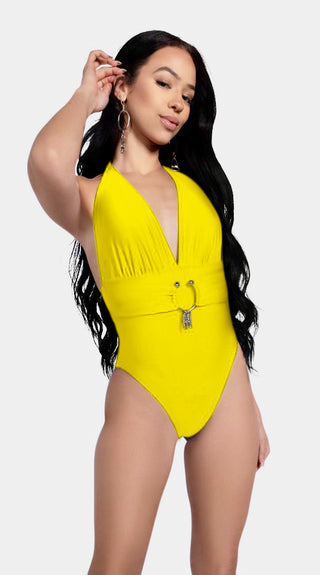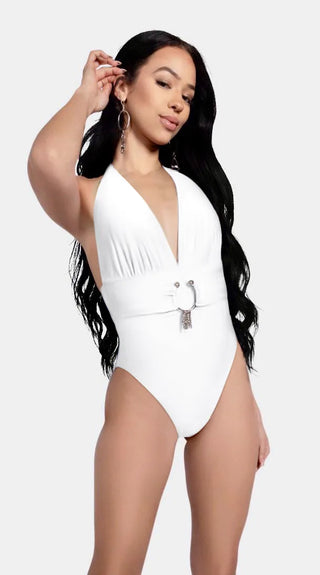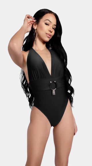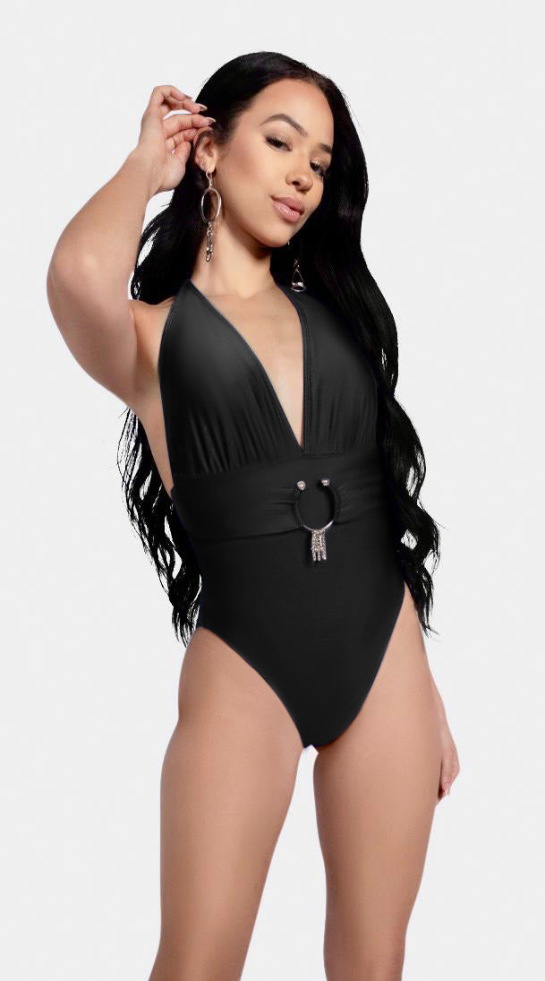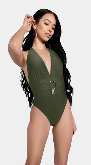 Deep plunging halter neckline with soft ruching that flatters every body, cinched by an oversized, rust-resistant Italian-made matte silver ring . The wide belt panel smooths and sculpts, while the high-cut legs and cheeky back give that endless-leg illusion. Clean, bold, and impossibly chic in 5 can’t-look-away solids.