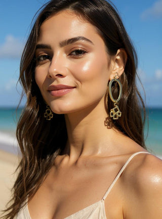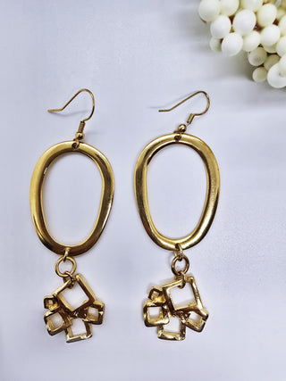 Bold gold-tone drop earrings with a modern geometric vibe. Each features a large, organically shaped oval hoop (hammered texture, slightly irregular) suspended from a gold hook, with a playful cluster of open cube charms dangling below. The cubes overlap and jumble like tiny golden gifts, adding movement and a touch of architectural edge.