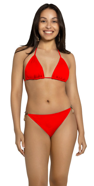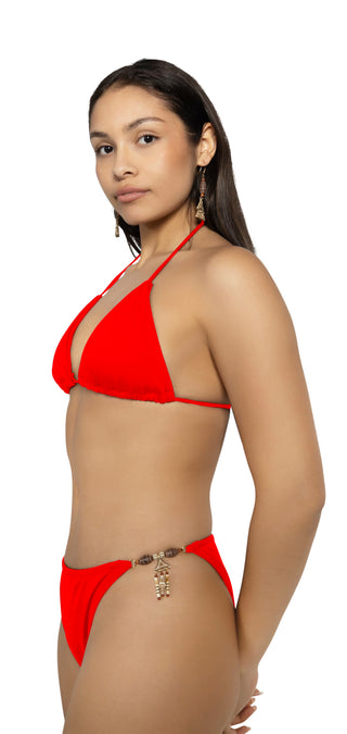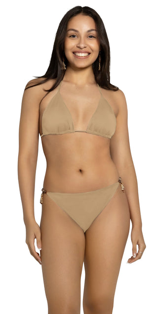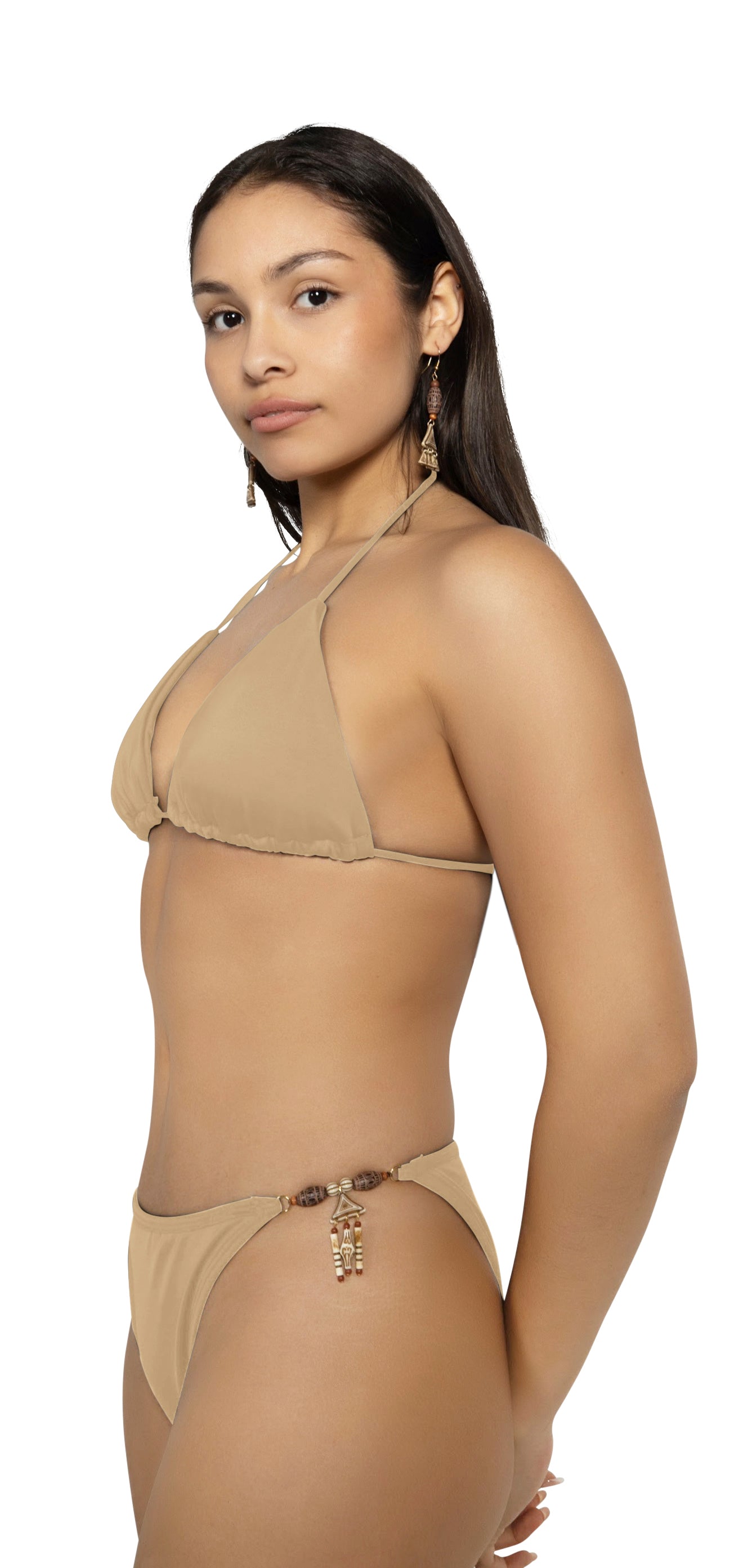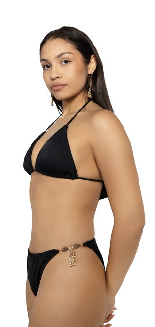 Classic triangle top with removable cups and Brazilian-cut bottoms in matte black Italian lycra that sculpts like second skin. The magic is in the details: hand-carved Milan-made medallions on each hip, inspired by the Safaris in Africa.