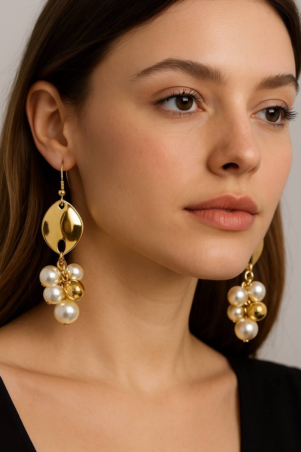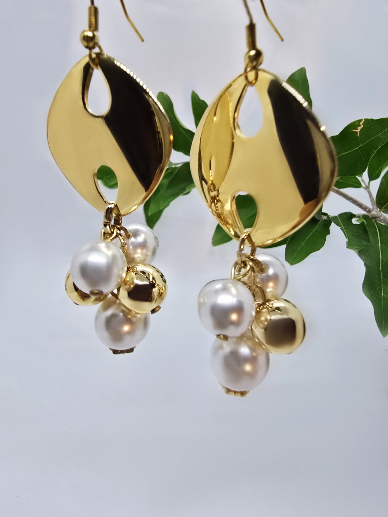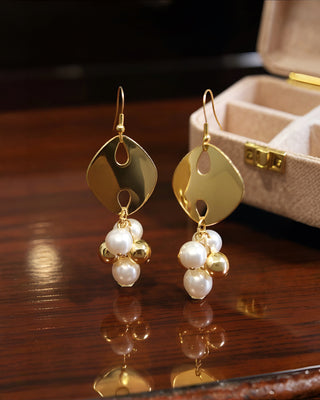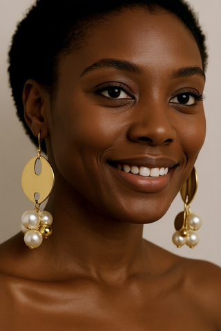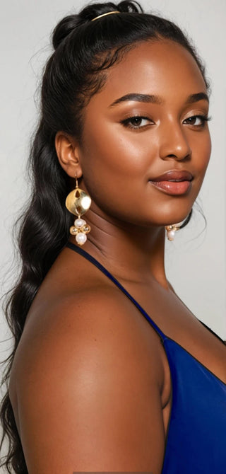 Pure Italian glamour. A glossy 18k gold-plated disc with a modern teardrop cut-out swing above a playful cluster of luminous ivory pearls in different sizes, all linked with rich gold findings. Sophisticated yet effortlessly chic, these are made for sunlit lunches, yacht decks, and golden hour aperitivi along the coast.